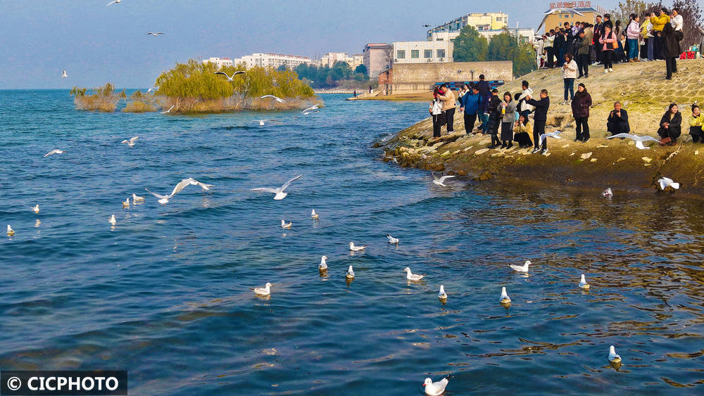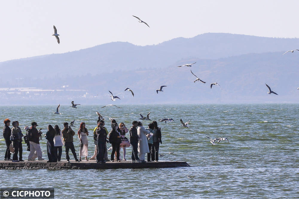 ↑2025年12月12日,人们在云南省昆明市呈贡区大渔街道海晏村观赏红嘴鸥。CICPHOTO/徐贤华 摄
