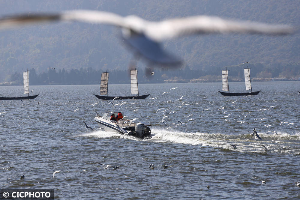 ↑2025年12月12日,游客在云南省昆明市海埂大坝附近乘船观赏红嘴鸥。CICPHOTO/徐贤华 摄