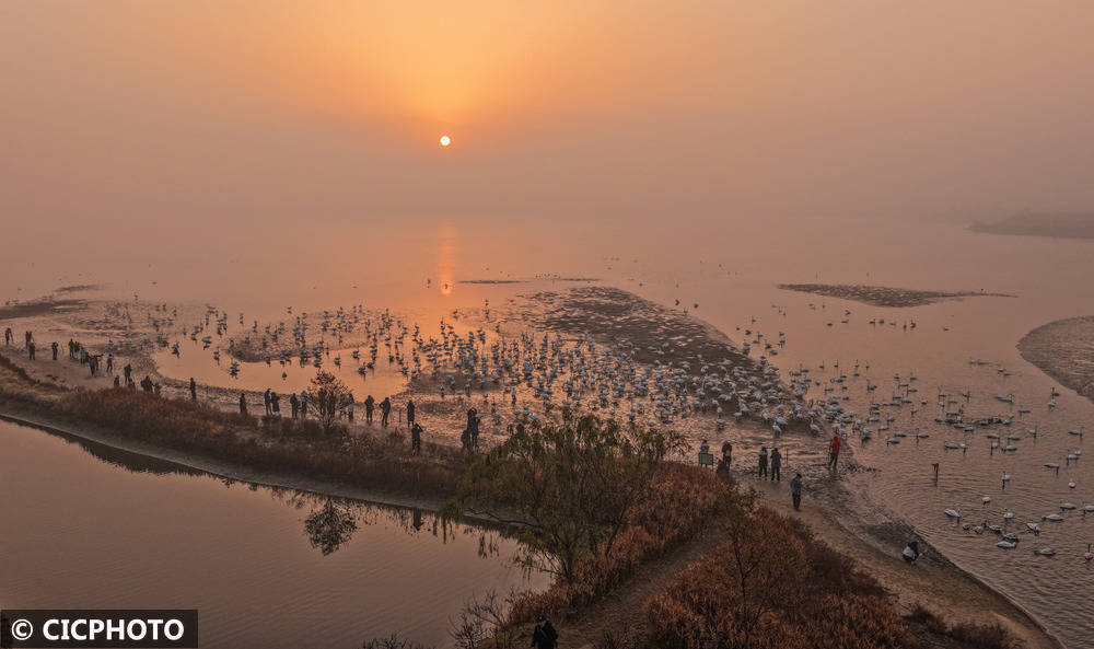 ↑2025年11月30日清晨,人们在山东省荣成市成山镇鸿鹄湾摄影区观赏大天鹅。(无人机照片)CICPHOTO/李信君 摄