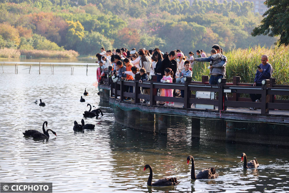 ↑2025年12月11日,人们在福建省厦门市五缘湾湿地公园观赏黑天鹅。CICPHOTO/丰晓飞 摄