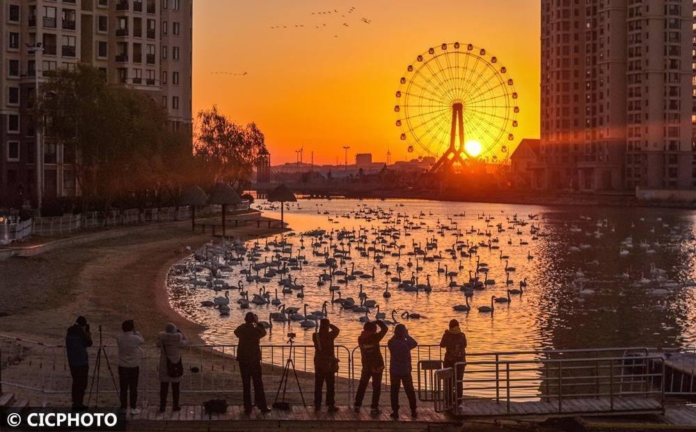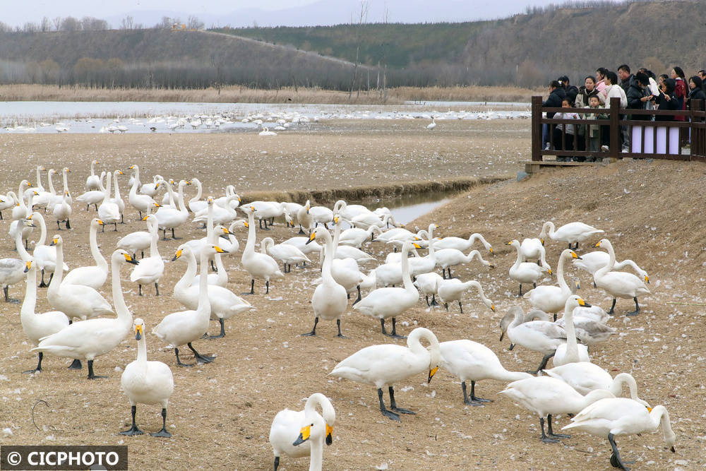 ↑2025年12月20日,游客在河南省三门峡市天鹅湾观赏天鹅。CICPHOTO/牛书培 摄