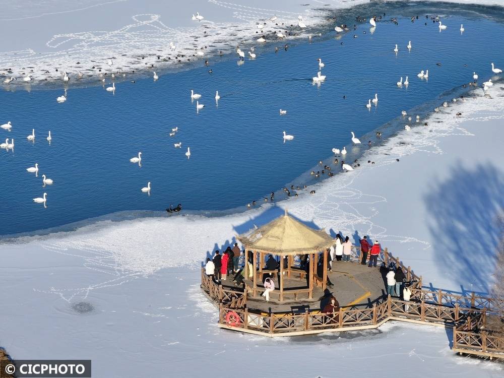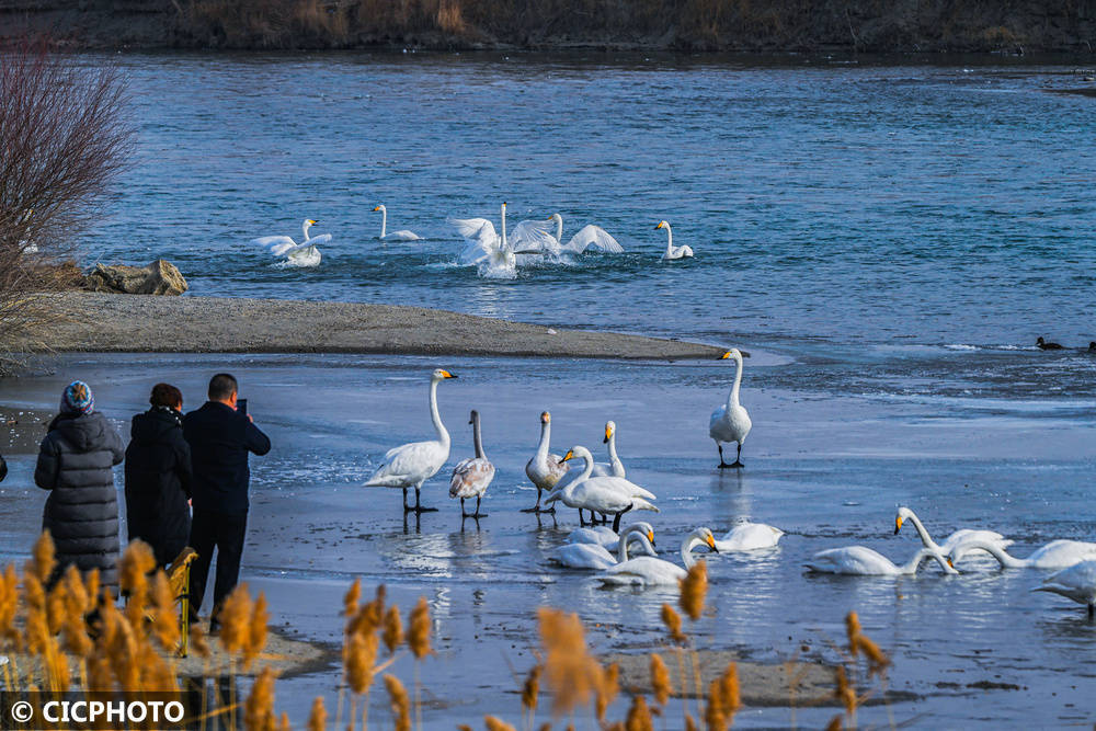 ↑2025年12月13日,人们在新疆生产建设兵团第二师开都河天鹅湾观赏天鹅。CICPHOTO/韩峻 摄