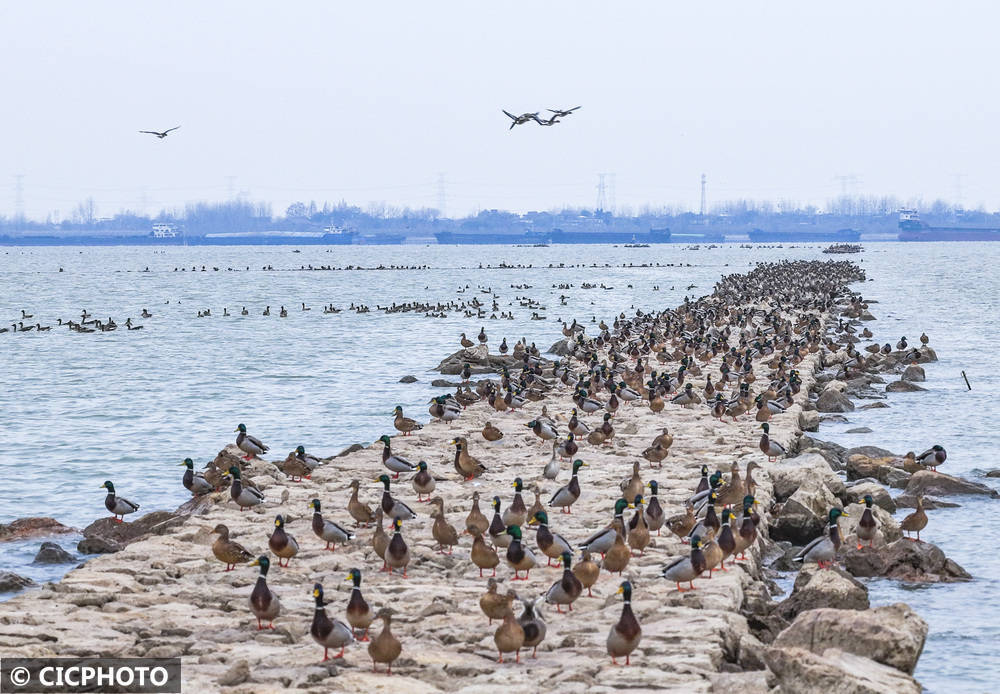 ↑2025年12月22日,成群的候鸟在安徽省芜湖市繁昌区和鸠江区交界的长江岸线浅水区域、滩涂湿地翔集。(无人机照片)CICPHOTO/鲁君元 摄