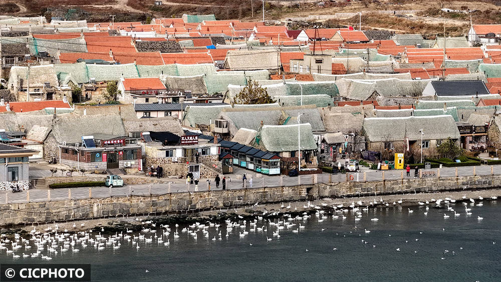 ↑2025年11月27日,人们在山东省荣成市俚岛镇烟墩角村海湾观赏大天鹅。(无人机照片)CICPHOTO/杨志礼 摄