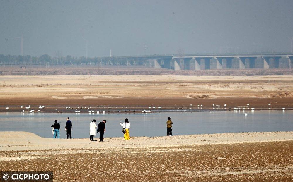 ↑2025年11月30日,人们在陕西省渭南市华州区柳枝镇渭河畔观赏天鹅。CICPHOTO/崔正博 摄
