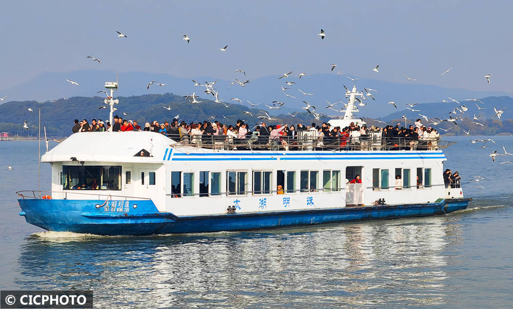 ↑2025年11月21日,游客在江苏省无锡市太湖鼋头渚景区乘船观赏红嘴鸥。CICPHOTO/牛书培 摄