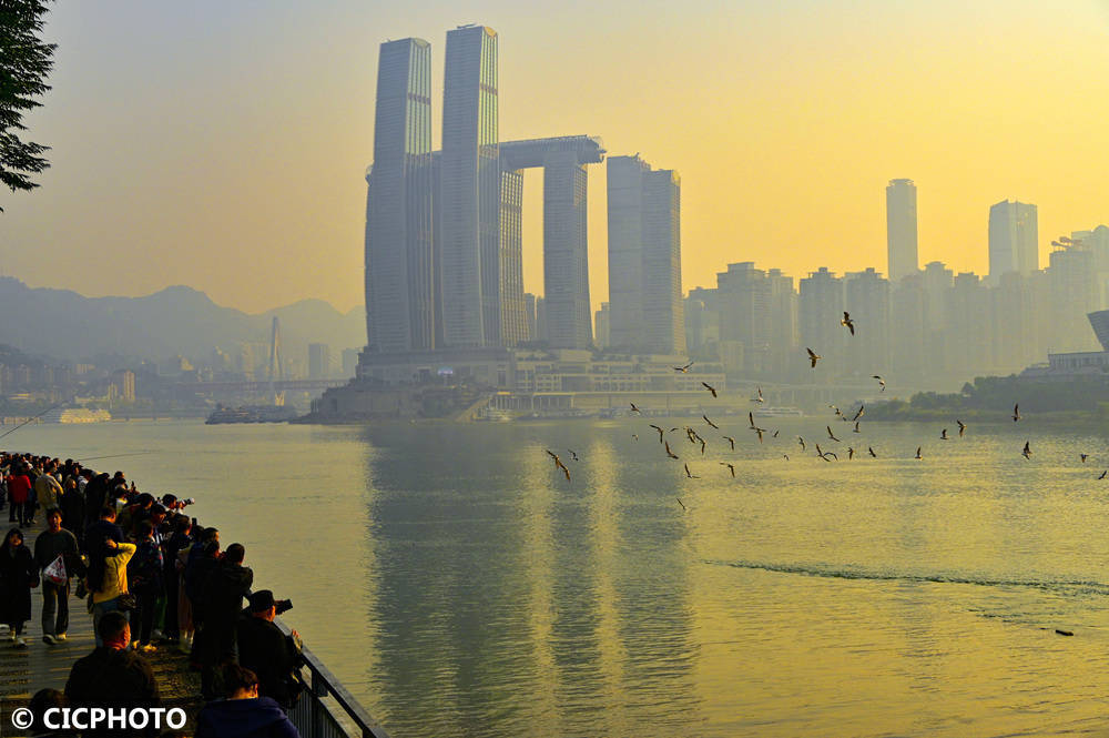 ↑2025年11月29日,人们在重庆两江交汇处观赏红嘴鸥。CICPHOTO/徐春茂 摄