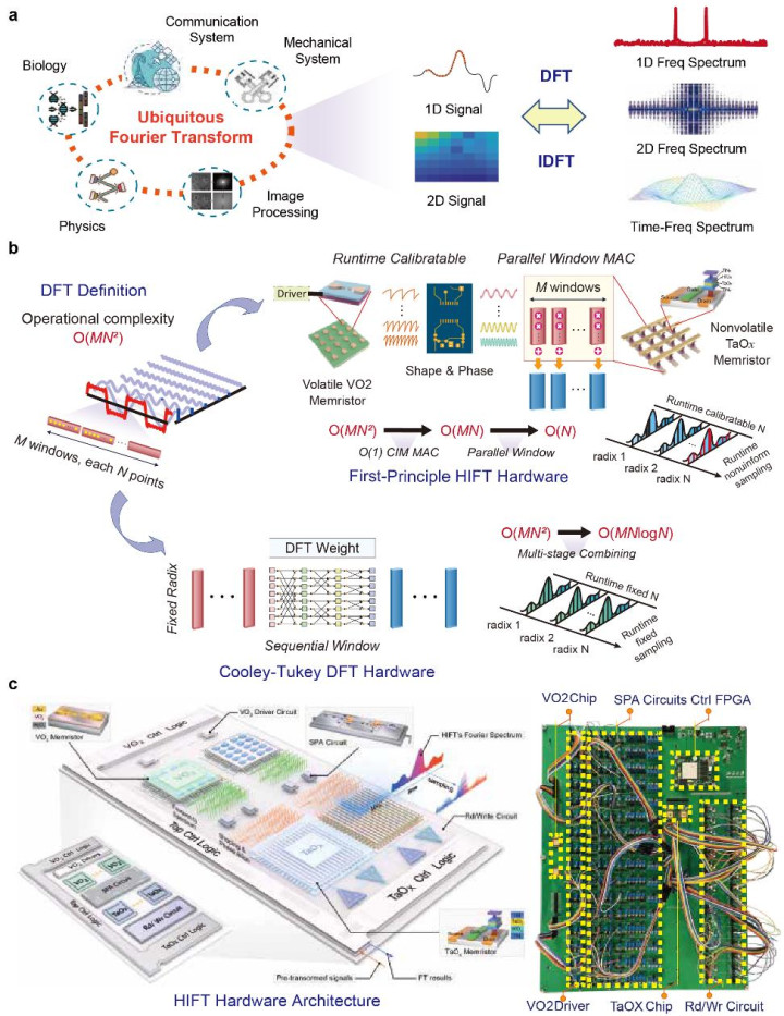 北京大学人工智能研究院陶耀宇研究员与集成电路学院杨玉超教授组成的科研团队在国际上首次实现了基于两种后摩尔器件异质集成架构的第一性原理傅里叶变换系统(Hetero-IntegratedFourierTransform,HIFT),提出了一种全新的、融合易失性与非易失性忆阻器的高通量频谱计算架构。
