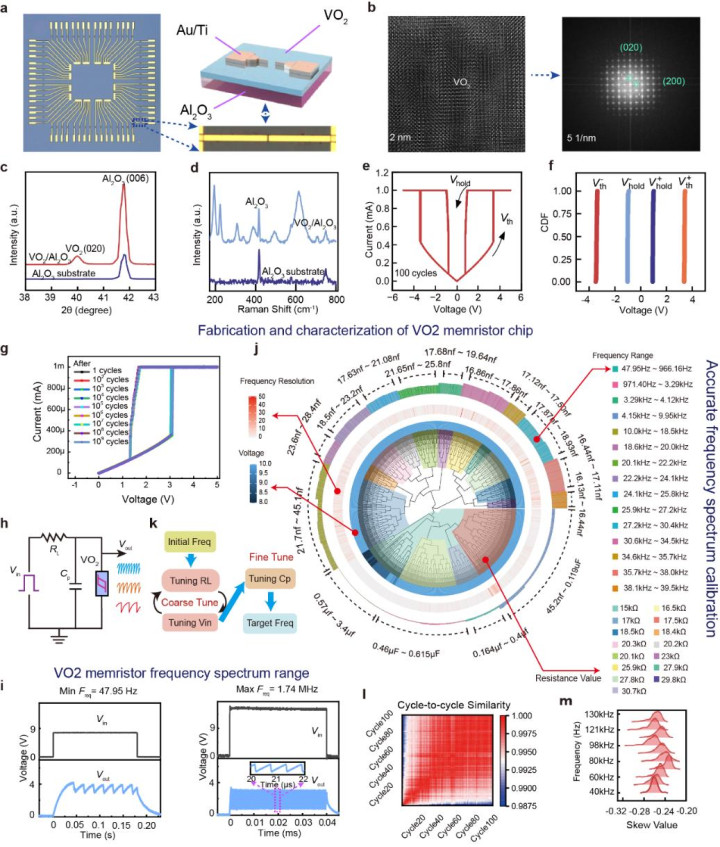 在频谱生成层,VO₂忆阻器阵列提供实时可调、高一致性振荡波信号,通过紧凑的整形与相位校准电路,可实现实时可校准的任意基数频谱构建,其输出频率最高可达1.74MHz,频率分辨率精度可达50Hz。VO₂忆阻器的相变特性使系统能够以物理方式产生类比正余弦波的基函数,从而以极低能耗实现可调频率激励,为傅里叶变换的多尺度特征分析提供了全新路径。
