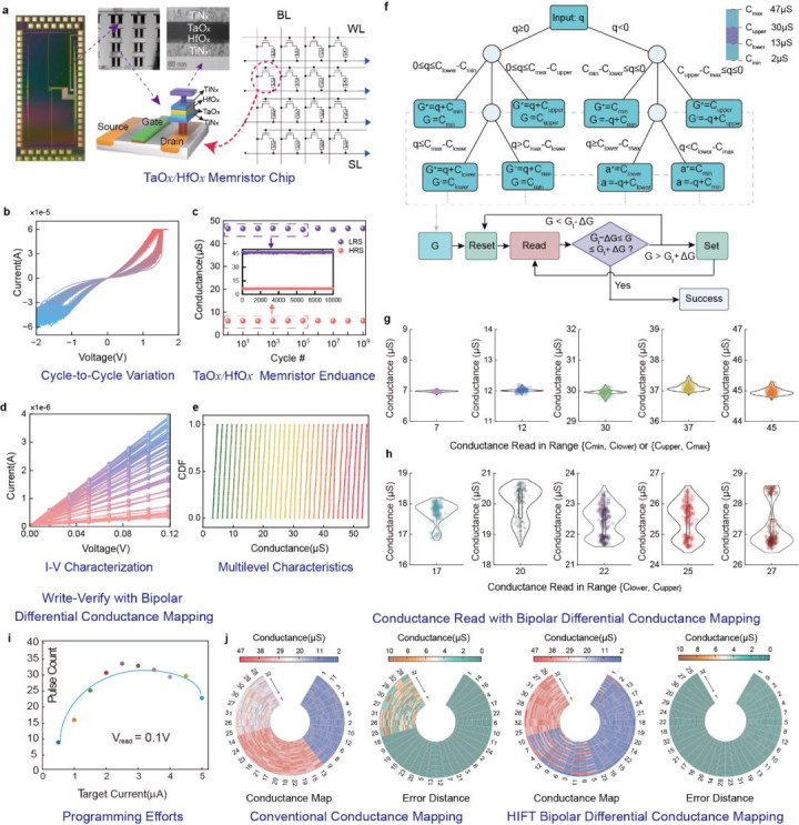 图3:TaOx/HfOx忆阻器阵列与双极差分电导映射
