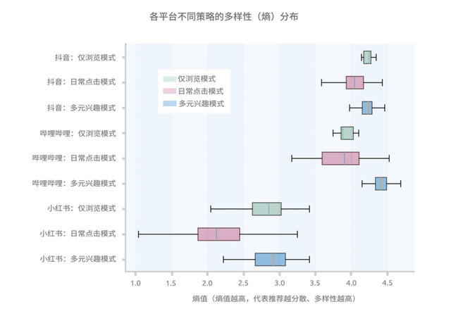 为从客观机制上验证这一观点,报告还开展了代理实验,揭示不同平台算法对用户行为的响应机制。课题组在抖音、哔哩哔哩、小红书创建虚拟账号,模拟仅浏览信息流、日常点击互动、搜索和评论多元内容等三种用户行为,追踪其首页推荐内容的多样性变化。研究发现,抖音的算法在保持高多样性的同时,能积极响应用户的探索意图;哔哩哔哩的推荐多样性则高度由用户行为驱动;小红书则以高效收敛、精准聚焦为主要特征。