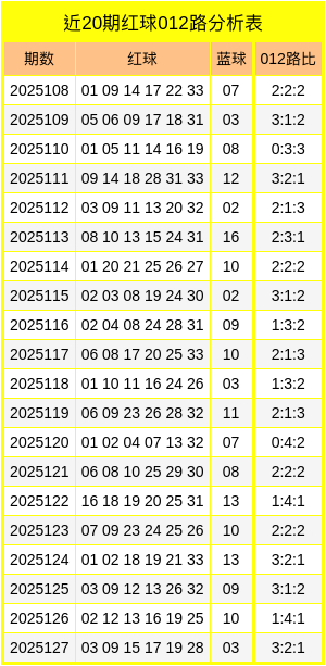 最近20期红球012路比为38:44:38,最近两周红球012路比为13:15:8,上期红球012路比为3:2:1。